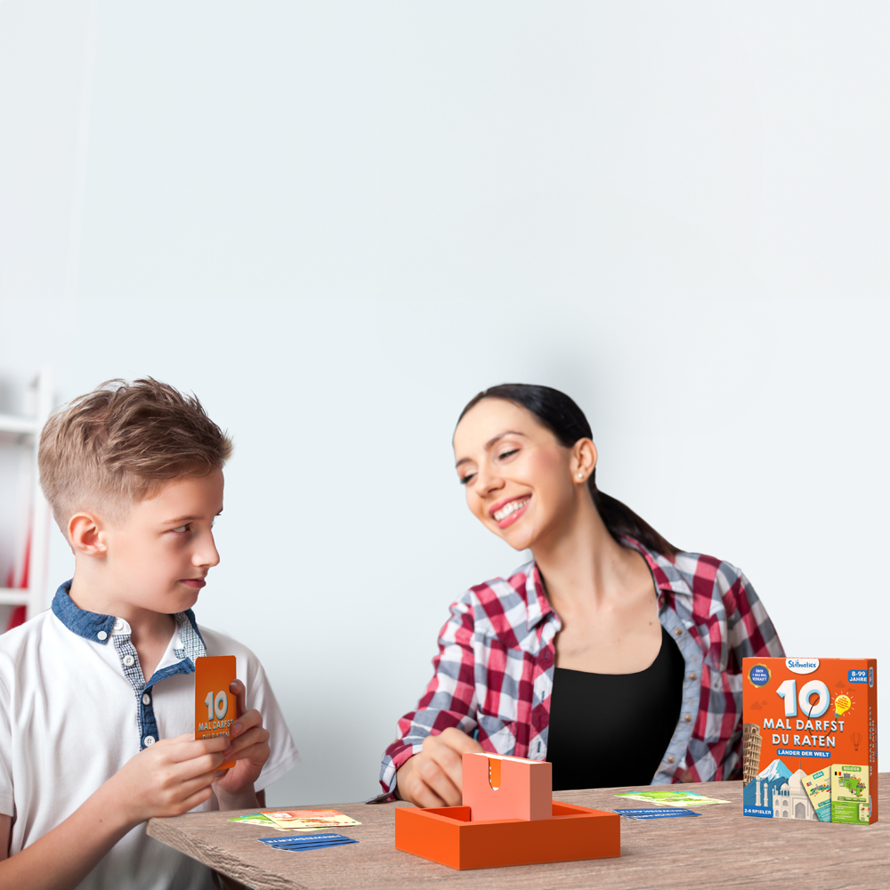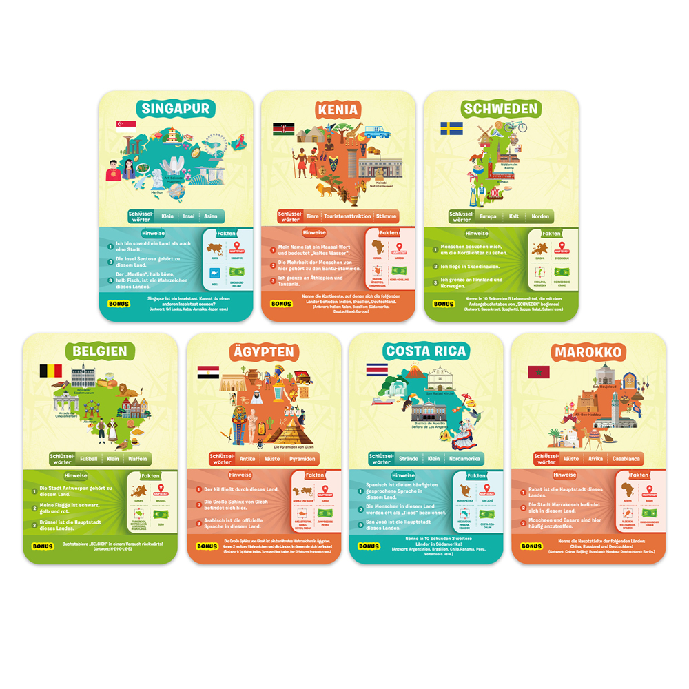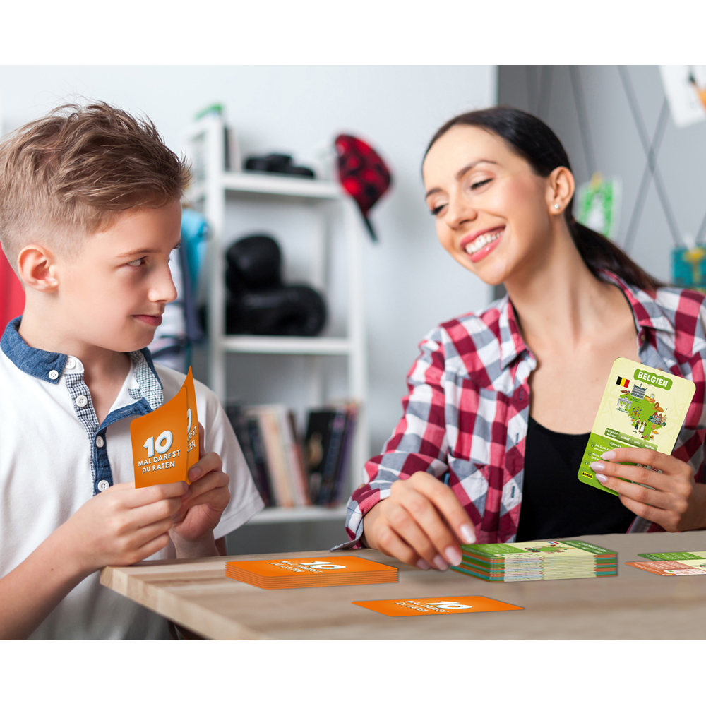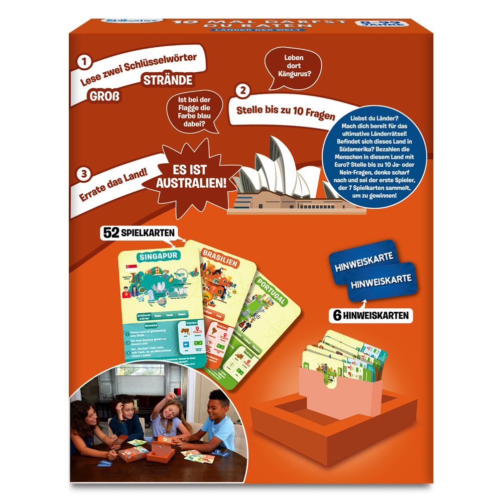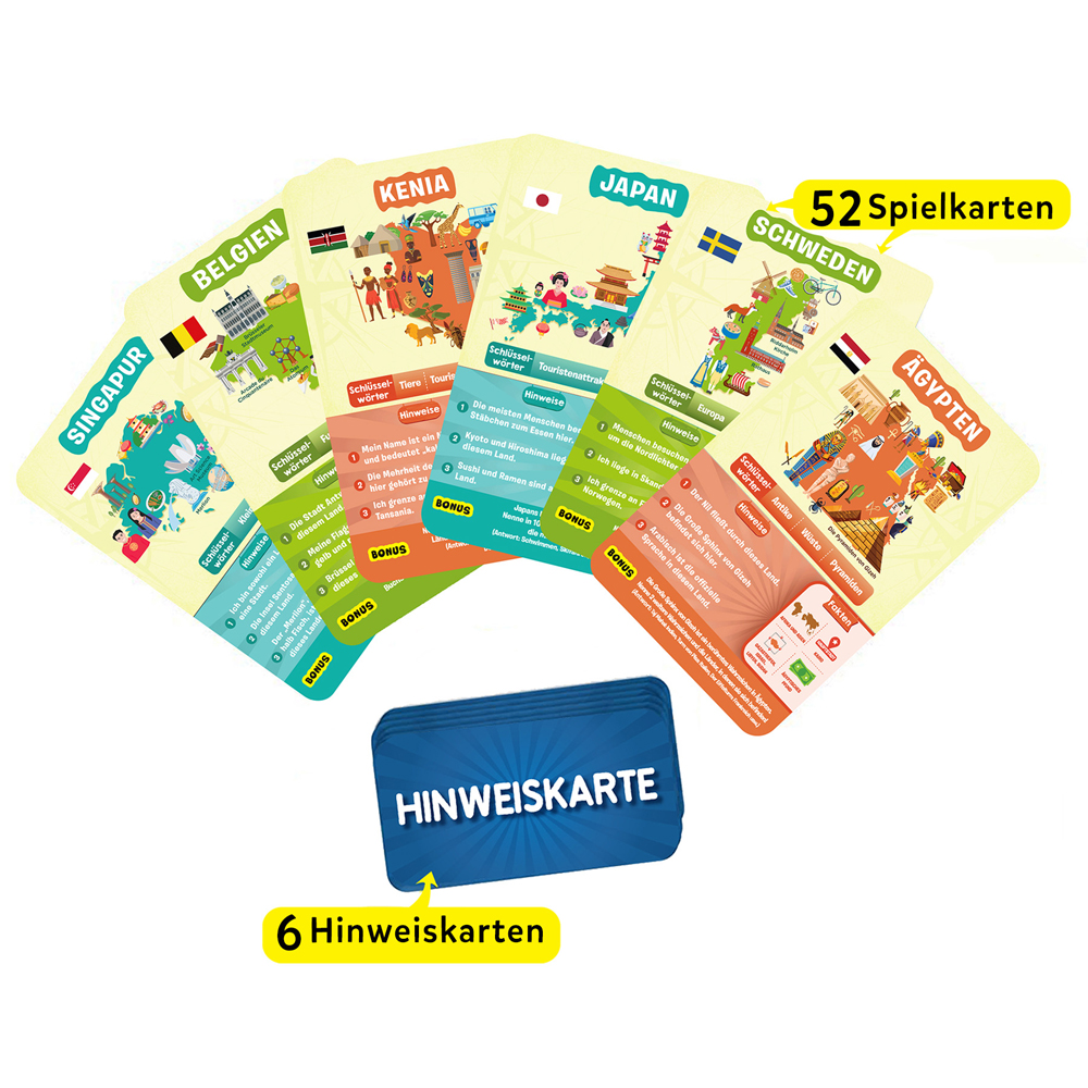 "Ein aufregendes Fragespiel erwartet dich - deine Herausforderung: Errate das Land auf der Spielkarte! Du kannst bis zu zehn kluge Fragen stellen. Handelt es sich um ein Land in Asien? Ist es eine Insel? Ist es Nepal? Nutze deine scharfe Denkfähigkeit, setze deine Hinweiskarten geschickt ein und sei der Erste, der sieben Spielkarten ergattert. Tauche ein in dieses spannende Abenteuer und zeige dein Wissen über die Länder dieser Welt!"
