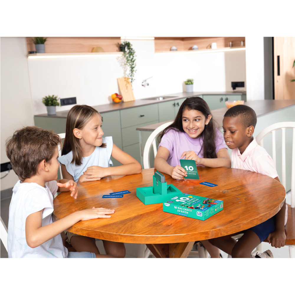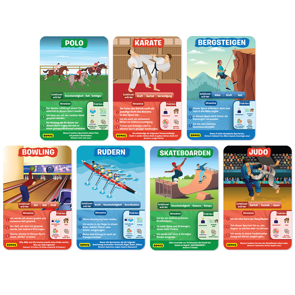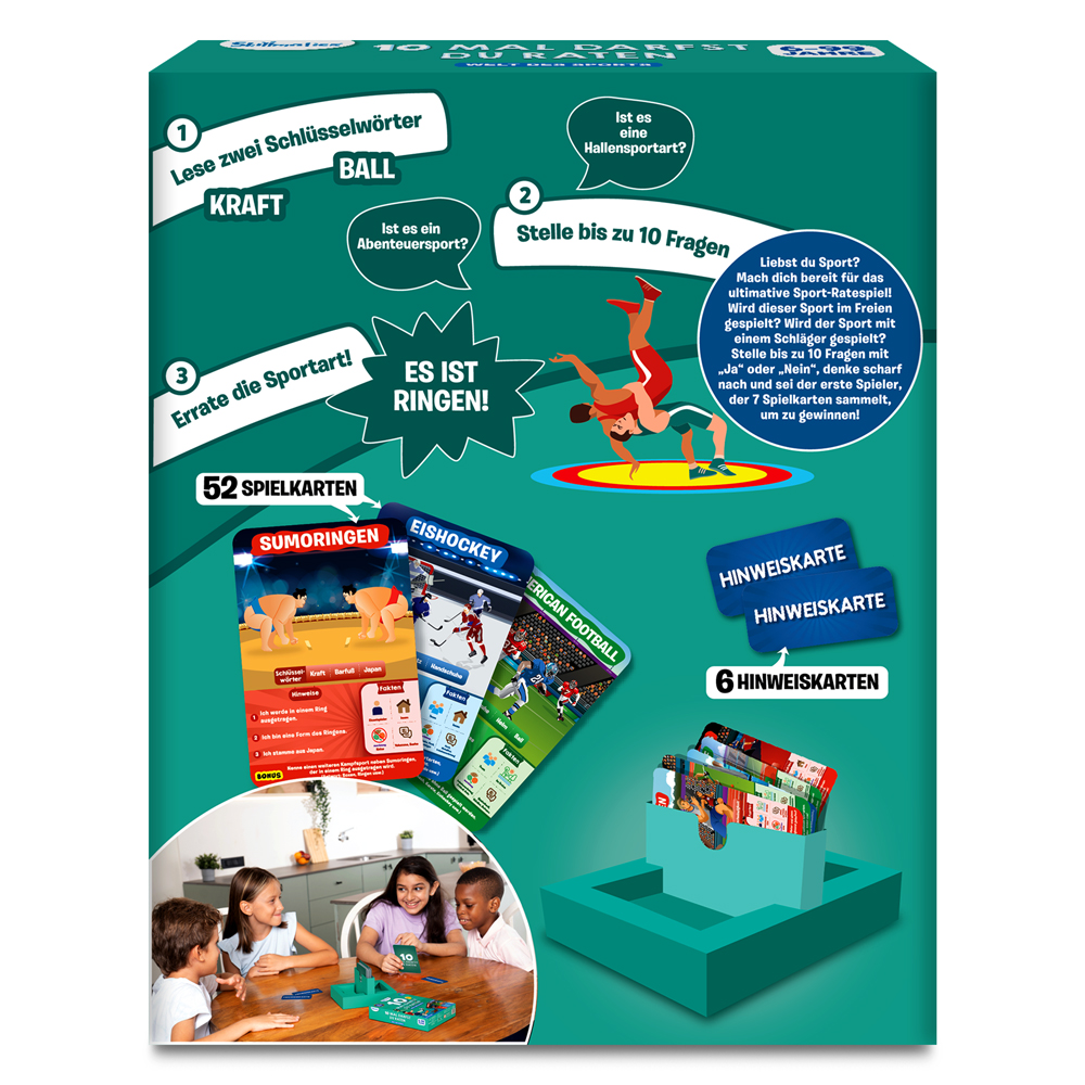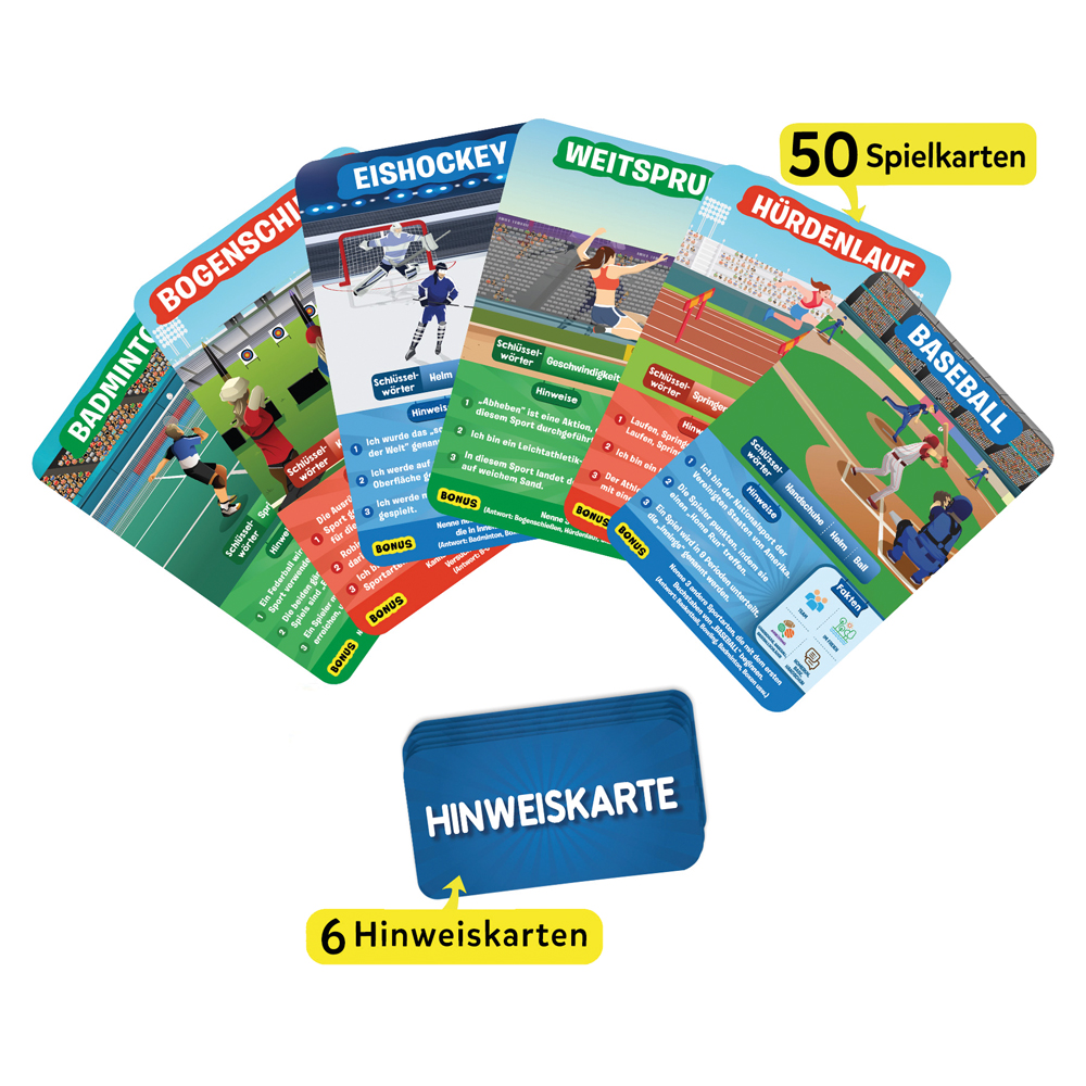Ein aufregendes Fragespiel erwartet dich - deine Herausforderung: Errate die Sportart auf der Spielkarte! Du kannst bis zu zehn kluge Fragen stellen. Wird in Teams gespielt? Ist es ein Sport im Freien? Ist es eine olympische Sportart? Setze deine scharfe Denkfigkeit ein, nutze deine Hinweiskarten geschickt und sei der Erste, der sieben Spielkarten ergattert. Tauche ein in dieses spannende Abenteuer und zeige dein Wissen er die Welt des Sports!