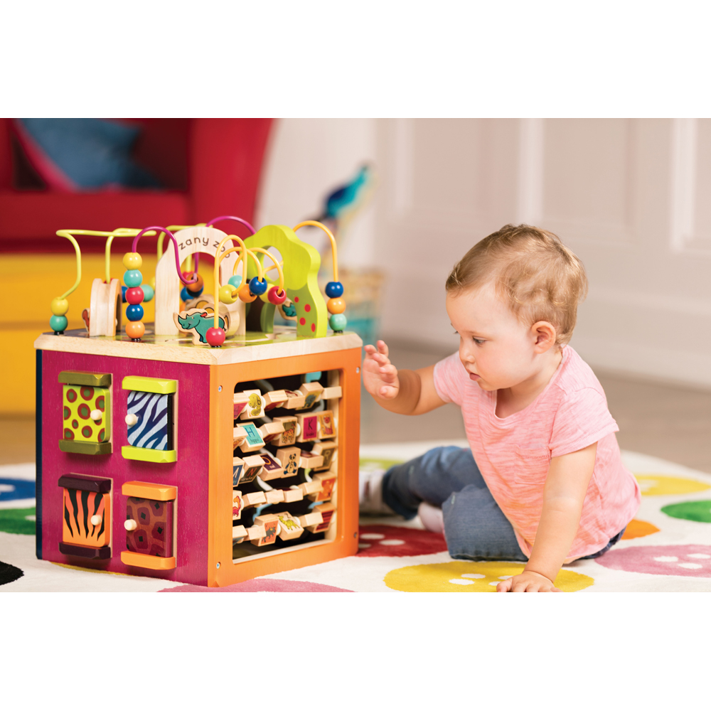 Dieser Spielewfel wurde aus bestdigem Qualitsholz handgearbeitet und leuchtet in prhtigen Farben. Man kann Ten fnen, wundersch illustrierte Tiere von A bis Z entdecken, den gewundenen Bahnen folgen, die Zick-Zack Pfade auf- und abrennen oder die Kreisel drehen. Der Motorikwfel Zany Zoo wird bestimmt die Neugier Ihres Kindes wecken. Auf den ff spielbaren Seiten des Wfels gibt es eine Menge zum Entdecken und vor allem Ausprobieren. erall lassen sich die verschiedenen Elemente drehen und bewegen und auf der Oberseite befindet sich eine tolle Motorikschleife. Aurdem sind dort in bunten Farben verschiedene Tiere zu sehen. Der Wfel bietet richtig viel Abwechslung, so kann Ihr Kind beispielsweise auch die Tierelemente die Zickzack-Pfade entlangziehen. Von 5 Seiten bespielbar