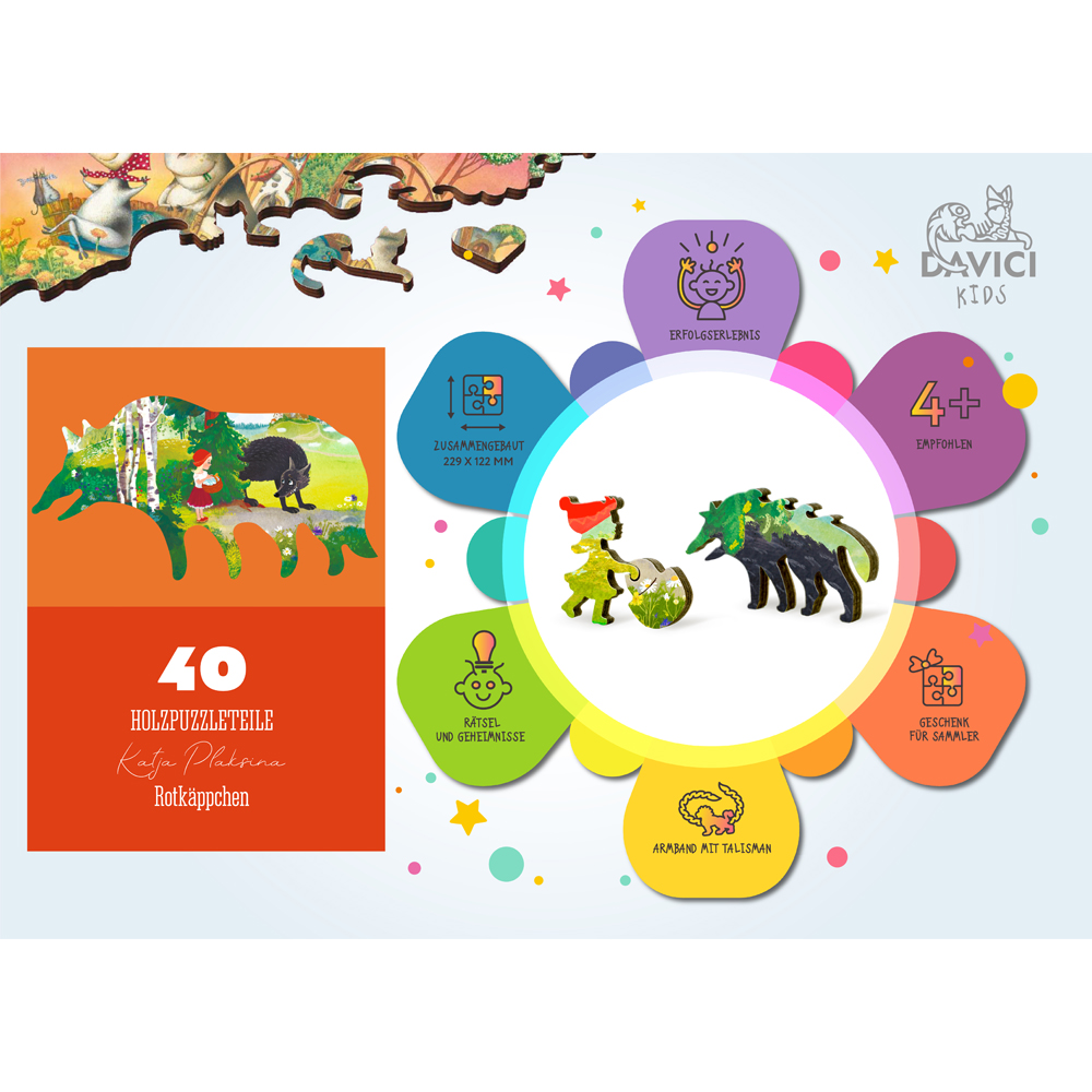 "Der reisende Igel. Kollektion DaVICI Kids. KünstlerIn Olga Popugaeva, Dmitry Nepomnyashchy DAVICI ist der aus Russland stammende Vorreiter im Bereich von Holzpuzzles mit fantasie-vollen Formen. Wie ein Buch erzählt die Box in deinen Händen die Geschichte der Kunstwerke mit Helden, Märchen und rätselhaften Handlungen. DaVICI steht für einzigartige Puzzles aus hochwertigem Birkenholz mit extravaganten Formen und Liebe zum Detail. Durch präzises Laserschneiden passen die aufwendig geformten Teile perfekt ineinander. In dieser Welt der Puzzles erwachen Menschen, Vögel und wilde Tiere, Könige und Wanderer, Sterne und Plane-ten zum Leben. Die Motive der Puzzles basieren auf Gemälden großer russischer Künstler. Das Gemälde des Künstlers ergibt in Kombination mit den Puzzleteilen, die auf die Geschichte des Autors abgestimmt sind, ein vollkommenes Meisterwerk. Beim Zusammensetzen der intellek-tuellen DAVICI Puzzles tauchst Du in eine erstaunliche Welt voller Illusionen, Geheimnisse und Mysterien ein. Ein haptisches Vergnügen mit großartigen Details und angenehmem Duft nach Holz. Die Puzzles von DAVICI schaffen wundervolle Erinnerungen und kostbare Gefühle, und beleben etwas, das wirklich wertvoll ist."
