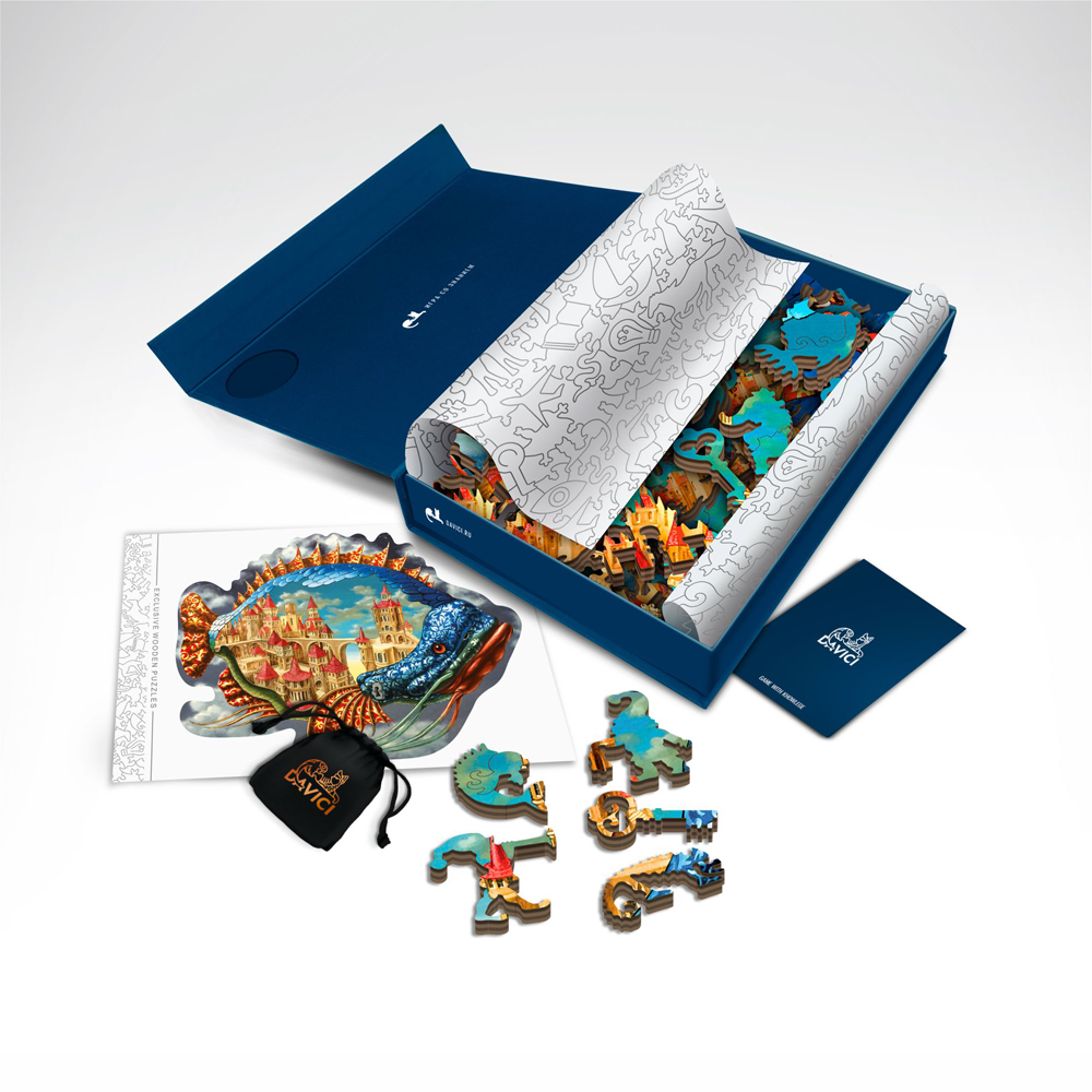 Der Stadtfisch - MAXI. Kollektion Nr. 1. KstlerIn Viktor Molew. Leinwand, , 2015 DAVICI ist der aus Russland stammende Vorreiter im Bereich von Holzpuzzles mit fantasie-vollen Formen. Wie ein Buch erzlt die Box in deinen Hden die Geschichte der Kunstwerke mit Helden, Mchen und rselhaften Handlungen. DaVICI steht f einzigartige Puzzles aus hochwertigem Birkenholz mit extravaganten Formen und Liebe zum Detail. Durch prises Laserschneiden passen die aufwendig geformten Teile perfekt ineinander. In dieser Welt der Puzzles erwachen Menschen, Vel und wilde Tiere, Kige und Wanderer, Sterne und Plane-ten zum Leben. Die Motive der Puzzles basieren auf Gemden gror russischer Kstler. Das Gemde des Kstlers ergibt in Kombination mit den Puzzleteilen, die auf die Geschichte des Autors abgestimmt sind, ein vollkommenes Meisterwerk. Beim Zusammensetzen der intellek-tuellen DAVICI Puzzles tauchst Du in eine erstaunliche Welt voller Illusionen, Geheimnisse und Mysterien ein. Ein haptisches Vergnen mit grortigen Details und angenehmem Duft nach Holz. Die Puzzles von DAVICI schaffen wundervolle Erinnerungen und kostbare Gefle, und beleben etwas, das wirklich wertvoll ist.