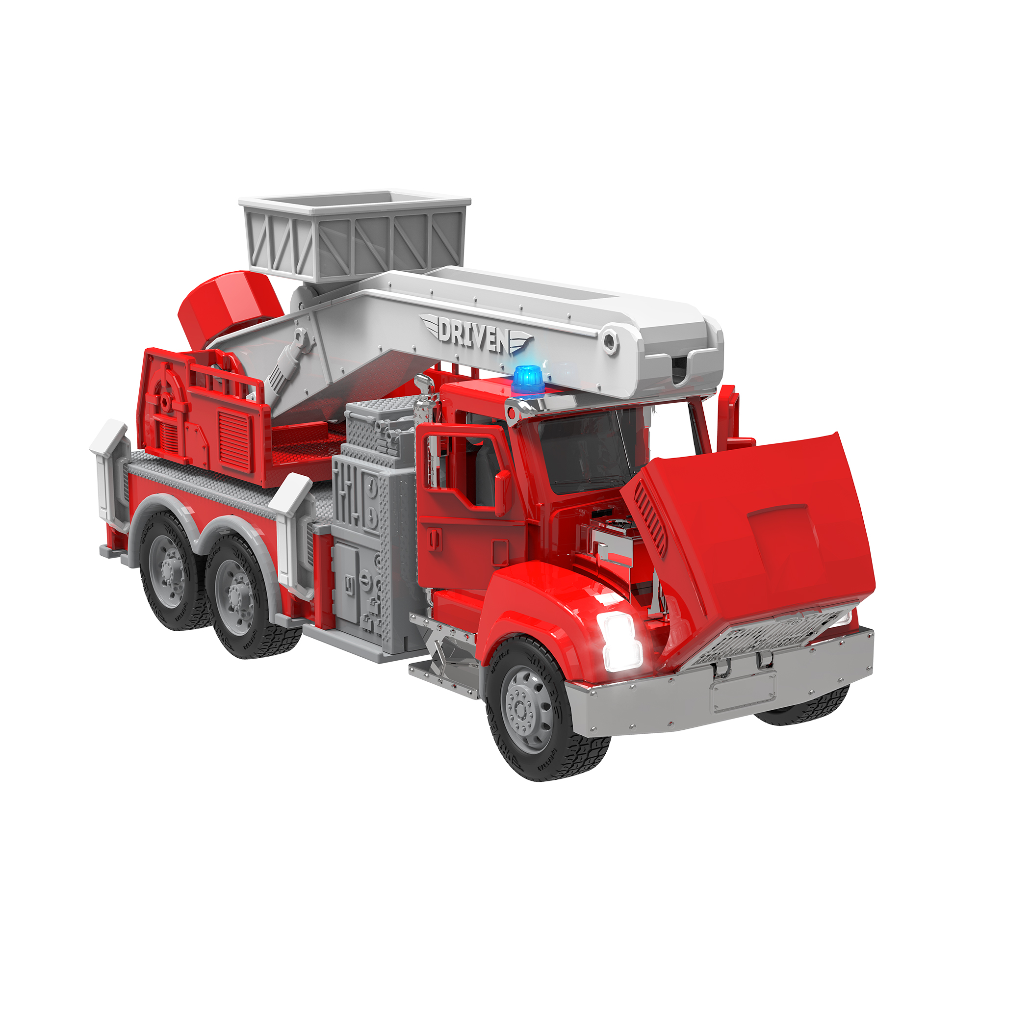 Erkunde die vielen tollen Features dieses coolen Feuerwehrautos von Driven - zum Beispiel die sich fnenden Ten und die Motorhaube, die sich anheben lst! Mit der ausfahrbaren Drehleiter erreichst du jedes Ziel! Rette deine Nachbarn aus einem Gebde und hilf ihnen, in den Korb zu steigen, der sich am Ende der Leiter befindet. Durch deine Rettungsaktion wirst du zum Held der Nachbarschaft. Und f Extraspabeim fantasievollen Spielen sorgt die realistische Kombination aus Licht und Sound!