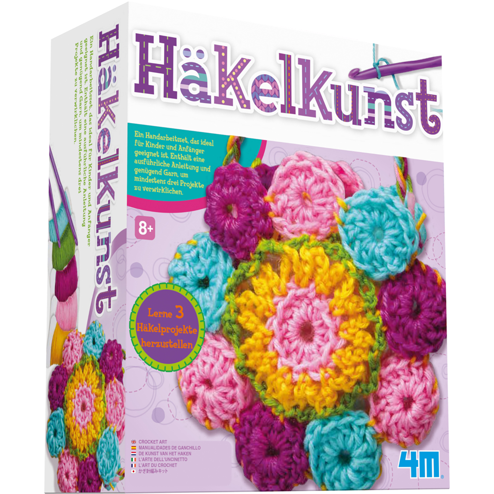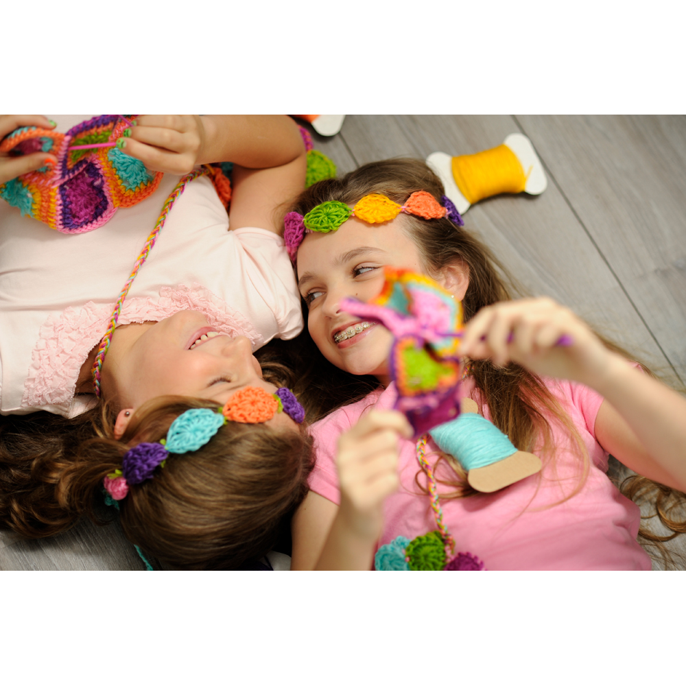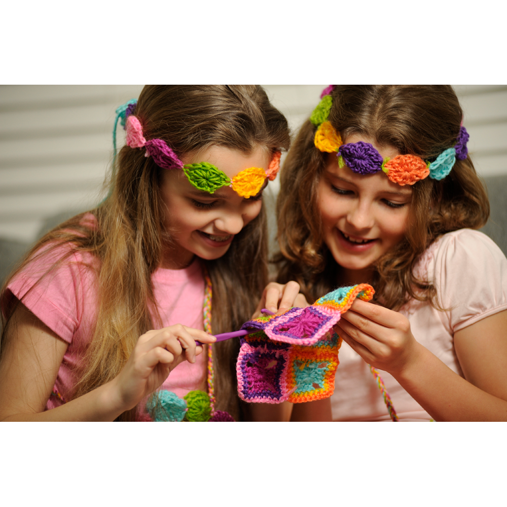 "Hier ist das ideale Häkelset für Kinder und Anfänger! Du kannst damit Untersetzter, Handtaschen, modische Gürtel oder Platzdeckchen häkeln. Tauche ein in die Welt des Häkelns und kreiere wunderbare Handarbeiten ganz nach deinem Geschmack!"