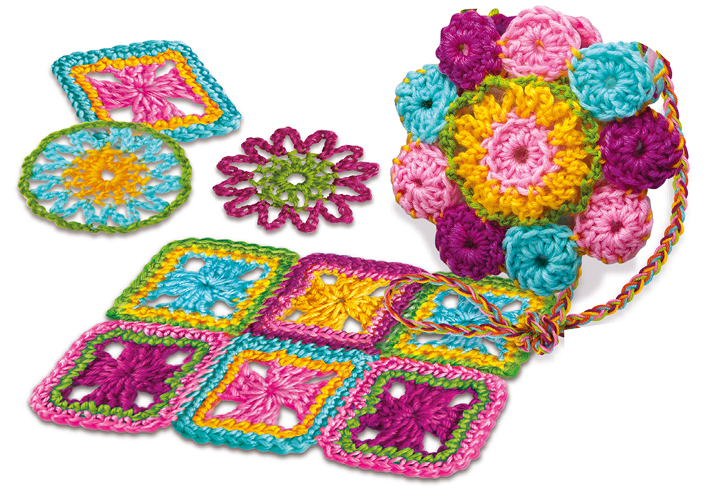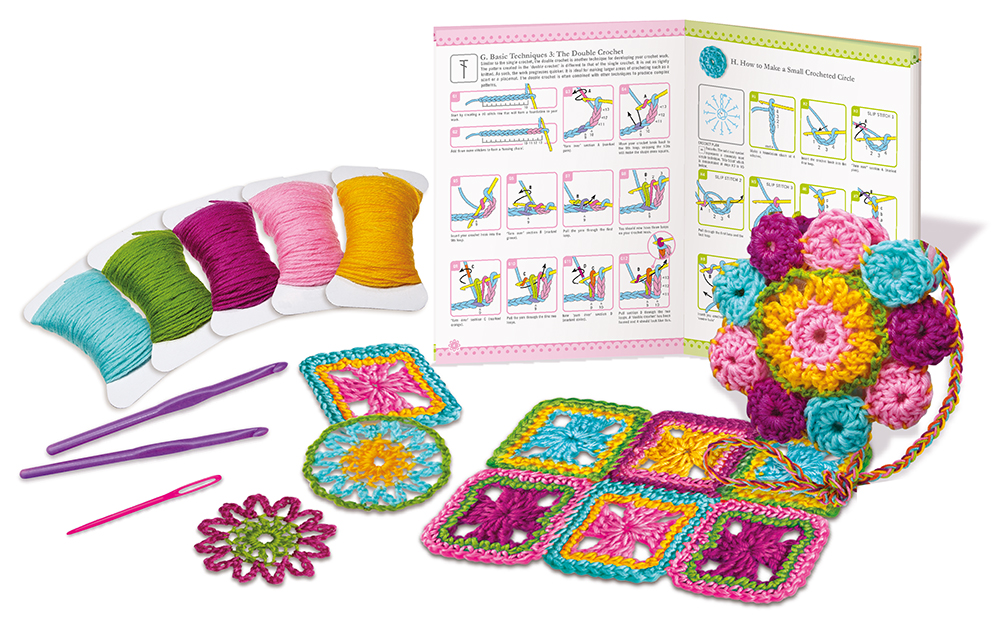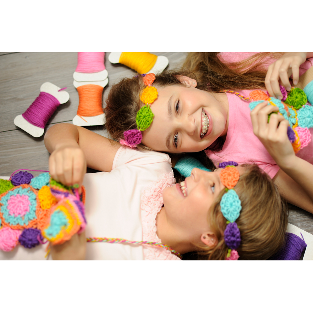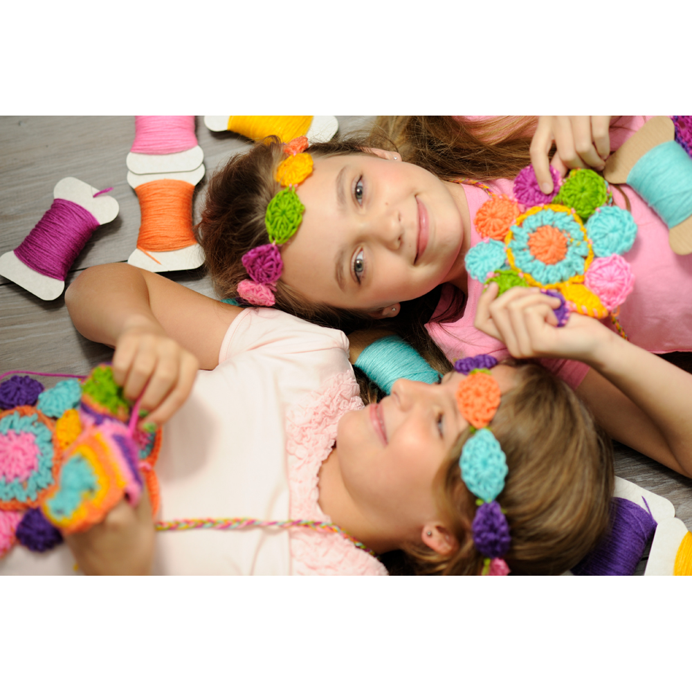 "Hier ist das ideale Häkelset für Kinder und Anfänger! Du kannst damit Untersetzter, Handtaschen, modische Gürtel oder Platzdeckchen häkeln. Tauche ein in die Welt des Häkelns und kreiere wunderbare Handarbeiten ganz nach deinem Geschmack!"