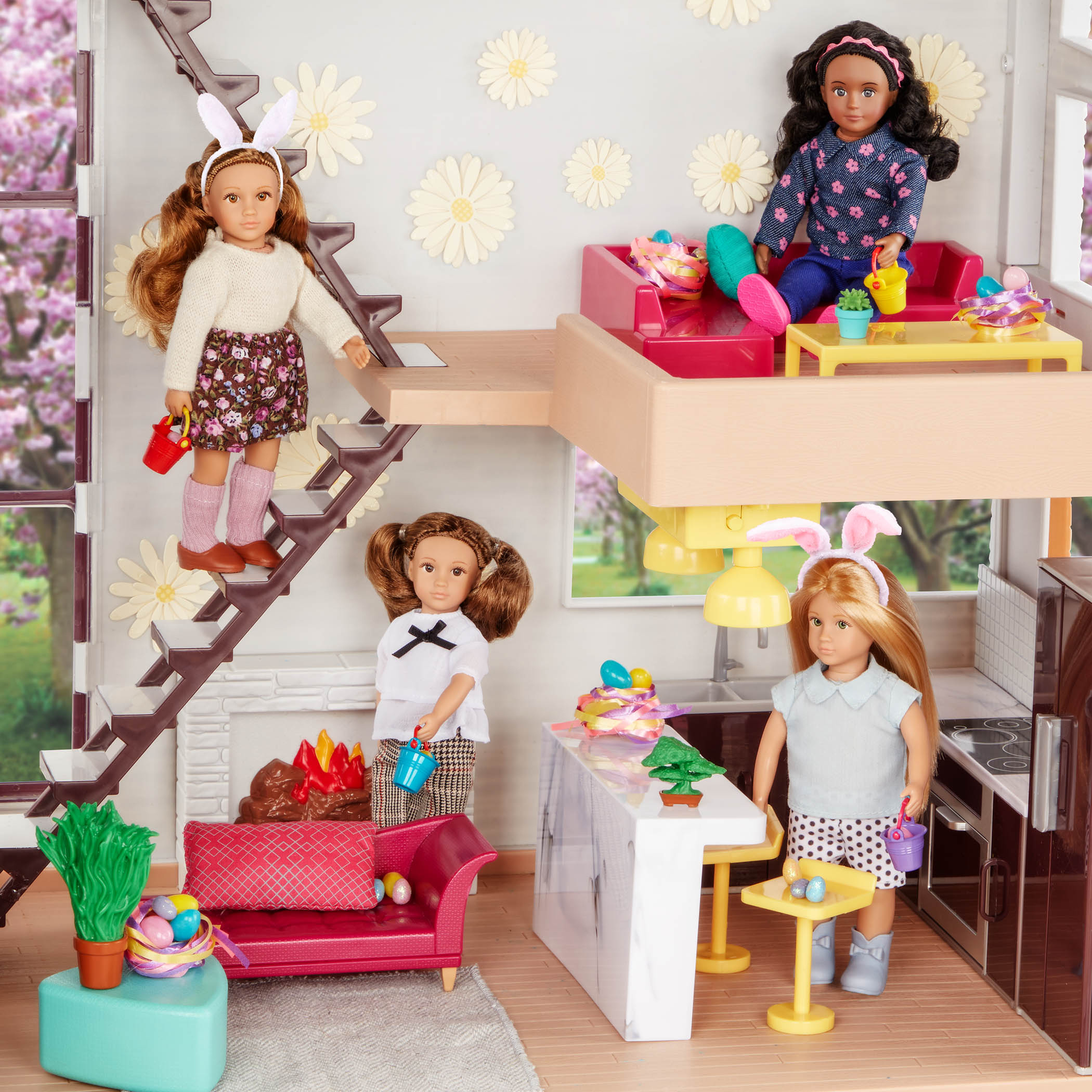 Entdecke das stylischste Zuhause in der Stadt f deine Mini-Puppen - Lori's Loft! Vom realistischen ren mit Backstein und Glas Look bis hin zu den 3 Ebenen mit Spielbereichen ist dieses luxurie Puppenhaus mit offenem Konzept das perfekte Zuhause f deine Lori-Puppen. Im Erdgeschoss befindet sich ein eingebauter Kamin und eine wundersche Khe mit Spe, Herd, Ofen, Klschrank und einer beweglichen Kheninsel im Marmordesign mit Hockern. Schalte die funktionierende Deckenlampe ein, um das Puppenhaus zu beleuchten. Durch die Treppe gelangt die 15cm gron Lori Puppe Brinne in den zweiten Stock und weiter bis zur Dachterrasse, um die beste Aussicht er die Stadt zu genien! Mit einer vollstdig offenen Seite und einer Eingangst zum fnen und Schlien kann sowohl innen als auch aun zu Spielbereichen gemacht werden. Dieses Spielset entht zudem ein Wohnzimmer-, Terrassen- und Schlafzimmermelset, so dass du dein Puppenhaus ganz nach deinen Wschen einrichten und dekorieren kannst. Dieses Loft Puppenhaus ist einfach ein Paradies!