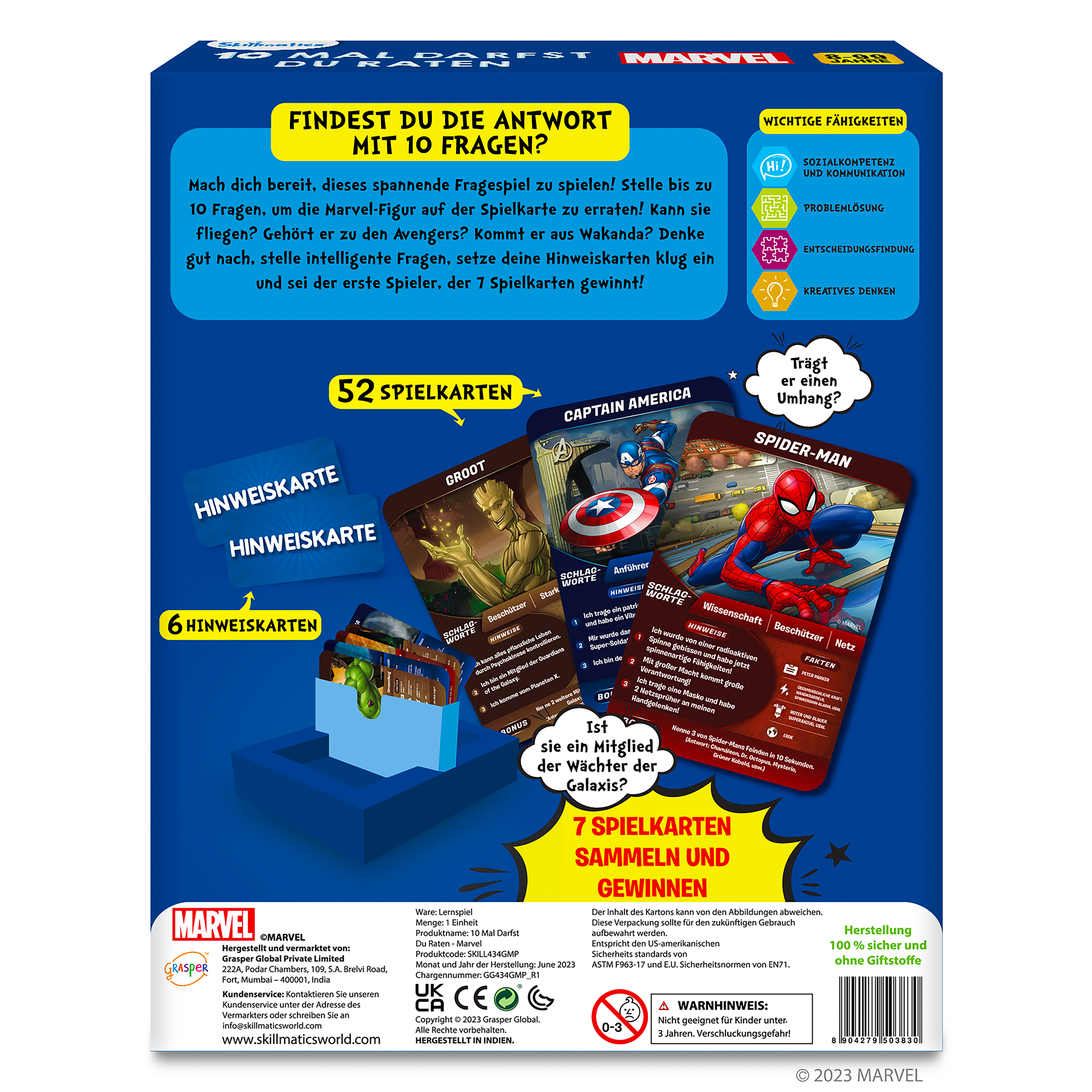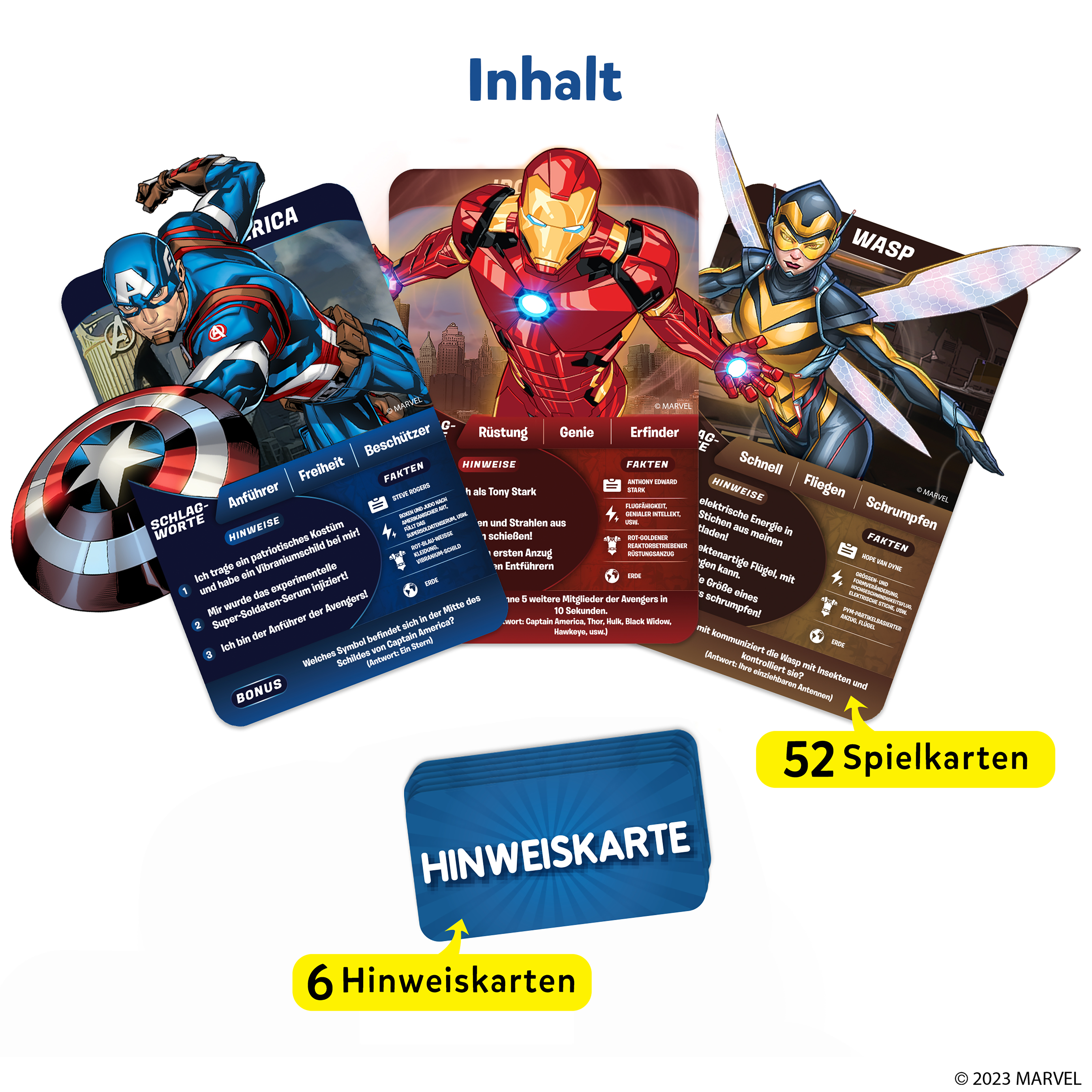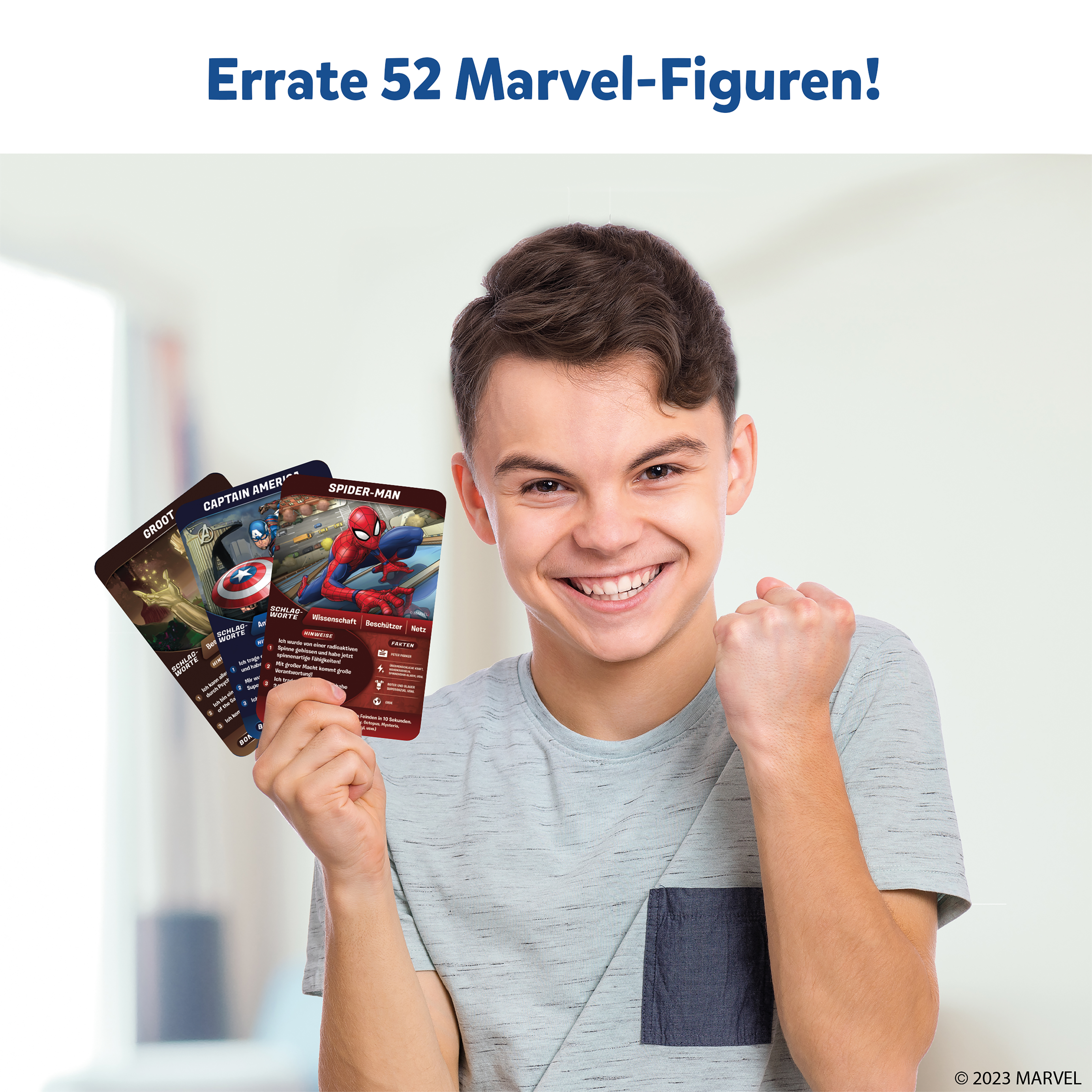 Bist du bereit f ein aufregendes Abenteuer in der Welt der Marvel-Superhelden? Deine Mission: Errate die Marvel-Figuren auf der Spielkarte, indem du bis zu 10 clevere Fragen stellst. Wer sind ihre Feinde? Welche unglaublichen Figkeiten besitzen sie? Nutze deine Scharfsinnigkeit und setze Hinweiskarten geschickt ein, um als Erstes sieben Spielkarten zu ergattern. Tauche ein in dieses spannende Abenteuer und beweise dein Wissen er die Marvel-Welt!