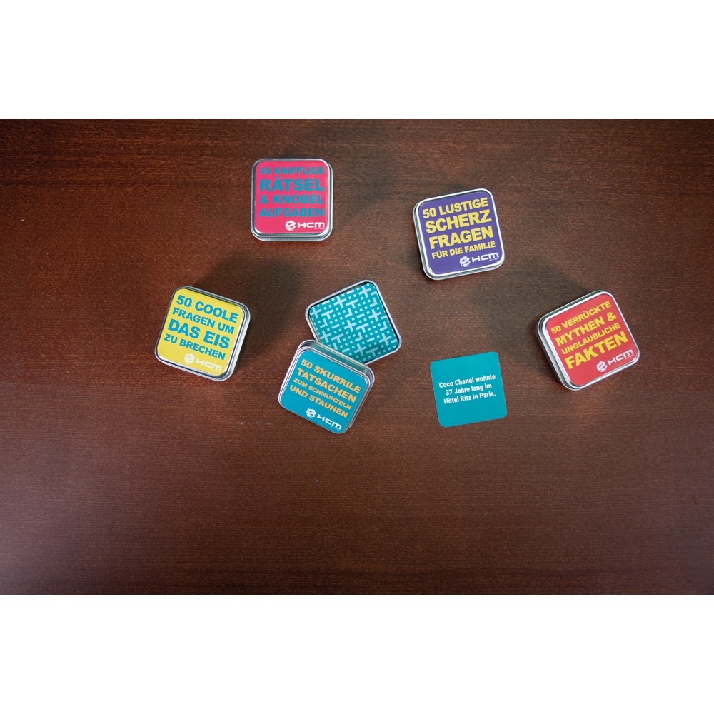 Das Display entht 8 originelle Kategorien f jede Gelegenheit. Das perfekte Mitbringsel, passt in jede Handtasche, ideal f unterwegs. F die nhste Party oder einfach einen gemlichen Abend unter Freunden mit diesen Spielen, Rseln und lustigen (Scherz-)Fragen werden sich deine Gte blendend amieren! Knt ihr erraten, welche verrkten Mythen wahr sind und welche frei erfunden? Welche 50 Dinge sollte man zumindest einmal im Leben ausprobiert haben? Die Vielzahl an Karten bietet unterhaltsame Gesprhsthemen f jeden so wird garantiert niemandem in der Runde langweilig!