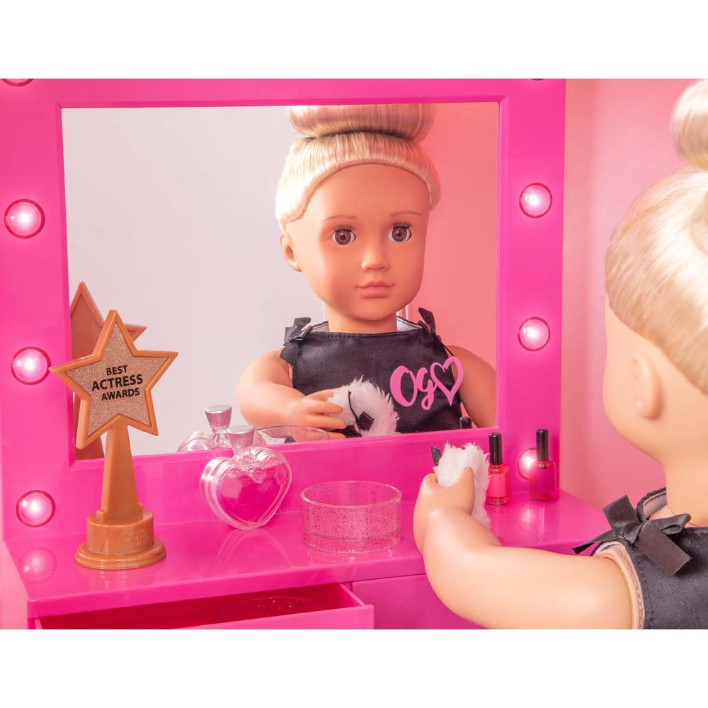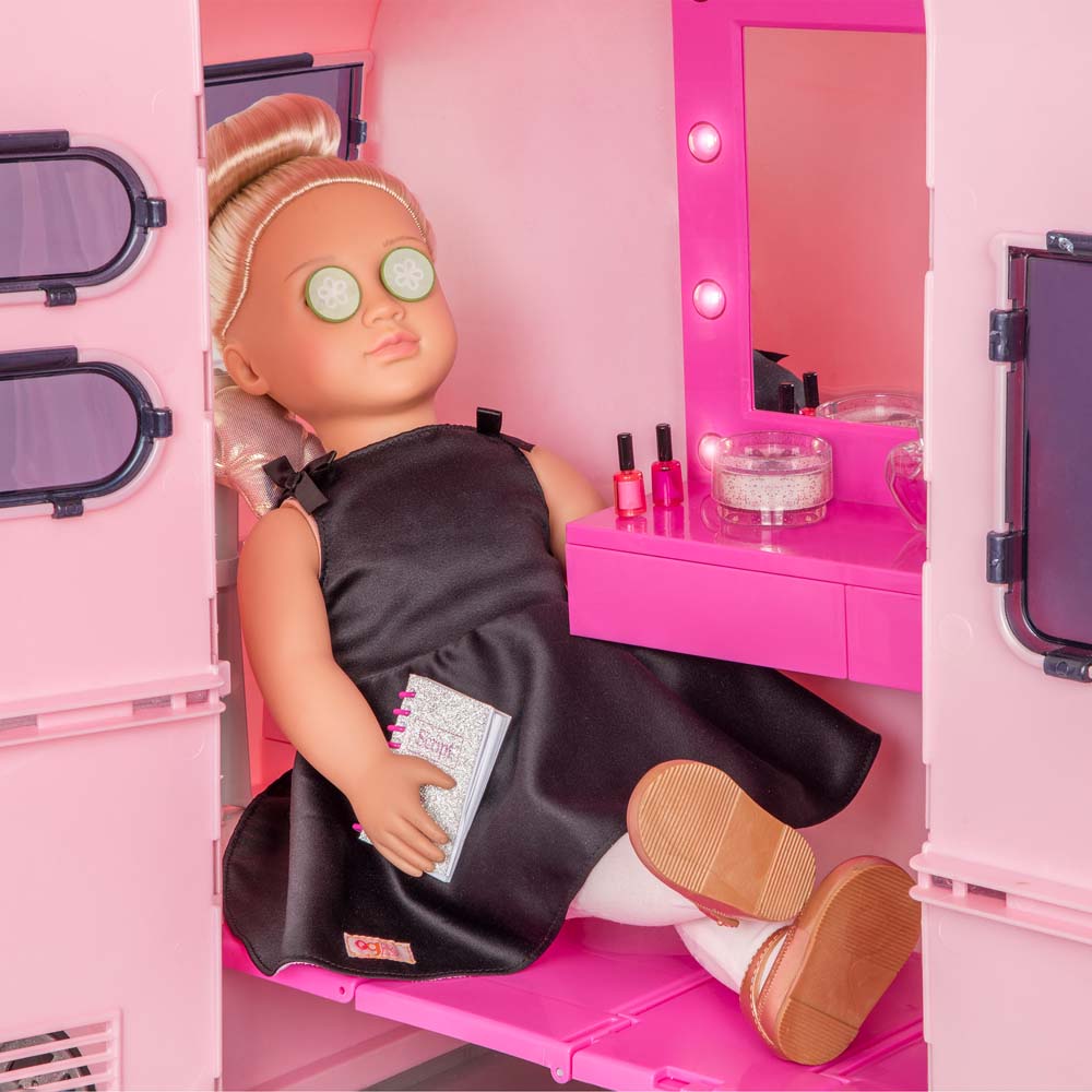 Bereite deine Puppen von Our Generation auf die gro Leinwand vor mit dem Our Generation Filmstar Trailer! Die tollen, realistischen Details sorgen f glamouren Spielspa Lass Deine Lieblingspuppe vor dem Spiegel Platz nehmen - jetzt kann das Styling beginnen! Wrend du ihr eine schicke Frisur verpasst, kann sie das Drehbuch lesen und ihren Text lernen, damit sie sper vor der Kamera einen tollen Job macht. Bestimmt wird noch ein richtig gror Star aus ihr! Einen ersten Filmpreis hat sie immerhin schon bekommen. Aber auch ein Star muss sich mal ausruhen und daf ist dieser Wohnwagen einfach perfekt!